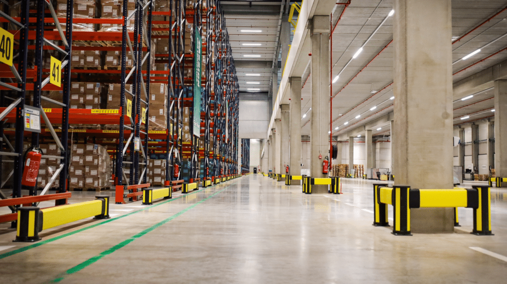 Ein weiteres Beispiel: Die Bodenschranke markiert eine starke physische Grenze auf Bodenhöhe zwischen Fußwegen und Fahrzeugwegen, die nicht nur zusätzlichen Schutz in Umgebungen mit Gabelstaplern, Flurförderzeugen und FTS bietet, sondern auch dazu beiträgt, Beschädigungen durch Gabeln und Paletten zu verhindern und die Organisation des internen Verkehrs deutlich zu verbessern.