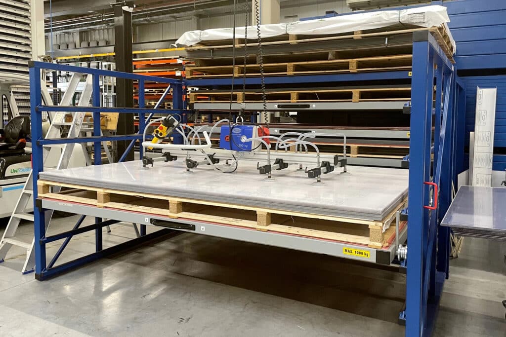 “Men kan platen ook verticaal opslaan, bijvoorbeeld in de platenstelling verticaal, verkrijgbaar in een licht en zwaar model. De laden zijn 100 % uitschuifbaar, waardoor de platen onmiddellijk beschikbaar zijn en men snel en veilig kan werken”, gaat de zaakvoerder verder. “Voor opslagruimten met een beperkte beschikbare diepte stellen we mobiele ladeframes voor. Onze platenstelling U-Box, een geautomatiseerde platenrek met elektrisch openschuifbare laden, is dan weer ideaal voor zware metalen platen tot 20 ton. Bij beide oplossingen worden de laden op rails gemonteerd. Zo kan men ze gemakkelijk verschuiven, waardoor een gangpad ontstaat.”